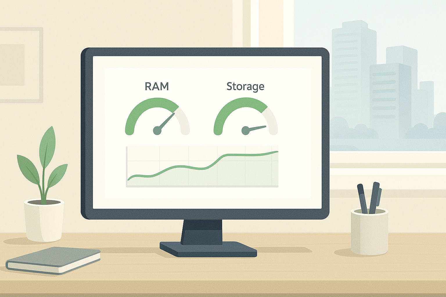Prompt : Illustration numérique horizontale (ratio 16:9), style clair et moderne. Au premier plan, un écran d’ordinateur sur un bureau sobre affiche un tableau de bord simple : jauges de RAM et de stockage dans le vert, et un petit graphique montrant une courbe qui monte puis se stabilise en plateau. La pièce est lumineuse et rangée. À travers une fenêtre derrière l’écran, on devine au loin la silhouette floue de grands data centers, sans menace ni dramatique. L’ambiance doit évoquer le contrôle, la frugalité et un usage raisonnable des ressources, malgré un contexte de pression sur la mémoire. Couleurs neutres avec quelques accents de vert pour la “santé” du système.