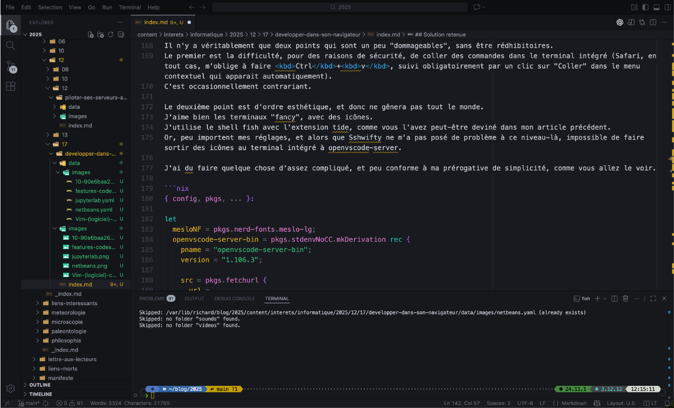 Capture d’écran personnelle de l’édition de l’article dans openvscode-server.