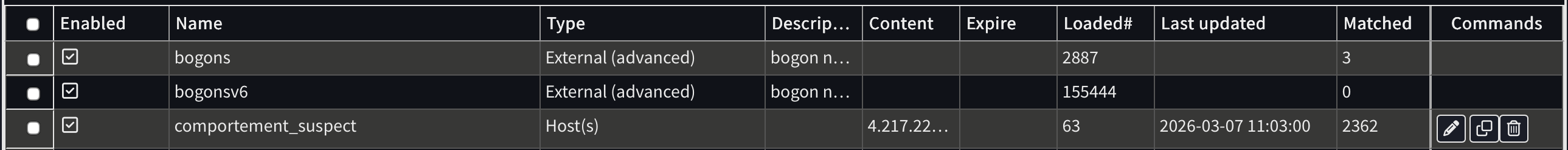 On peut voir alors l’alias se remplir, et le nombre de paquets matchés dans OPNsense. C’est efficace !
