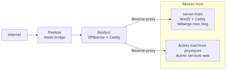 Derrière ma Freebox en mode bridge se trouve mon routeur sous OPNsense, sur lequel est installé le plugin Caddy en tant que reverse-proxy pour tout service web que je désire rendre accessible depuis Internet. Ces services sont hébergés sur différentes machines physiques de mon réseau, derrière le routeur.