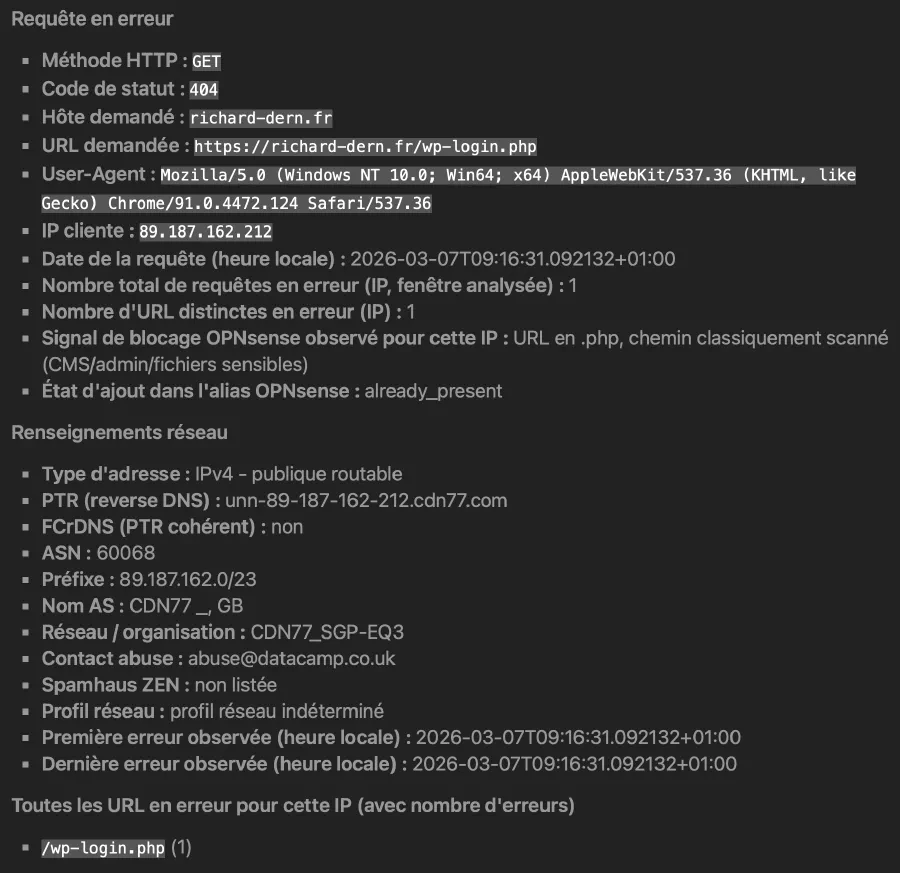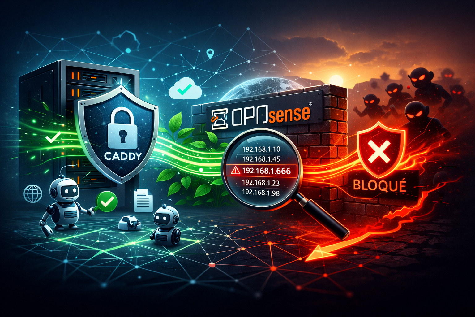 Mon besoin est un peu différent : je veux décider à partir des journaux HTTP de server-main, mais appliquer le blocage à l’entrée de mon réseau, sur OPNsense, via son API.