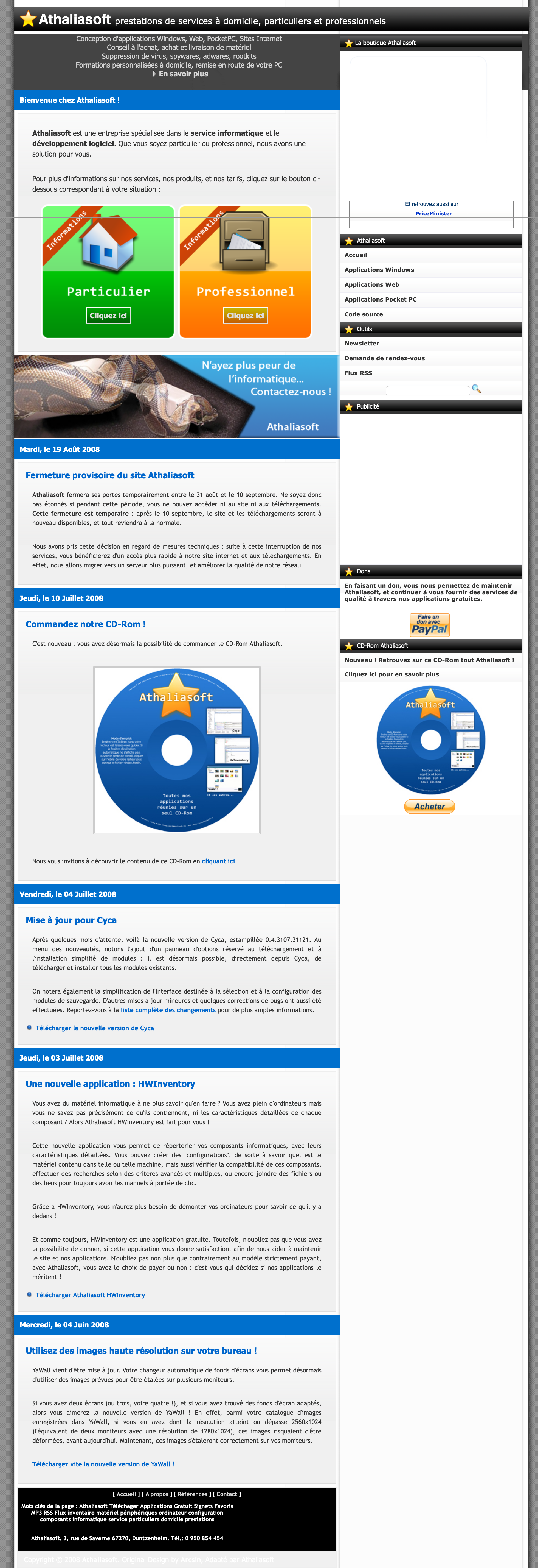 J’ai créé mon entreprise, Athaliasoft, en 2008. J’avais alors créé deux nouvelles applications (YaWall, un outil de changement de wallpaper à destination des possesseurs de plusieurs écrans, et HWInventory, qui permettait de gérer une base de données de pièces détachées informatiques et de créer des configurations à partir de ces pièces). Je continuais aussi le développement de Cyca, toujours en C#, que j’ai fini par rendre disponible au téléchargement public, sans grand succès.