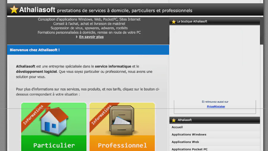 Je faisais (essayais de faire) du service informatique à domicile, du conseil à l’achat, des installations de matériel et du développement de sites web. Mais là encore, faute d’audience et de clients, j’ai arrêté mon activité, et supprimé définitivement le site et les applications.