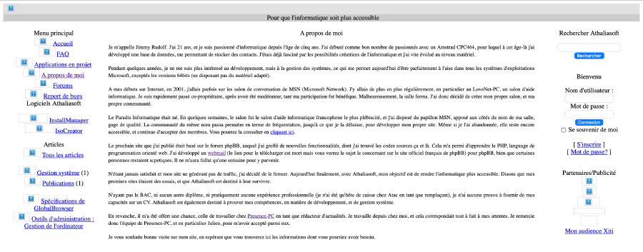 Vers la même période, j’avais repris le développement, et mes premiers sites et applications commençaient à apparaitre sur la toile. J’avais débuté avec PHP en créant un mod de webmail pour le moteur de forum phpBB dans sa version 2. Je regrette de ne pas l’avoir retrouvé dans les archives étant donné que ce projet avait été jugé trop complexe pour être réalisé ; pourtant, une semaine plus tard, je l’avais fait.