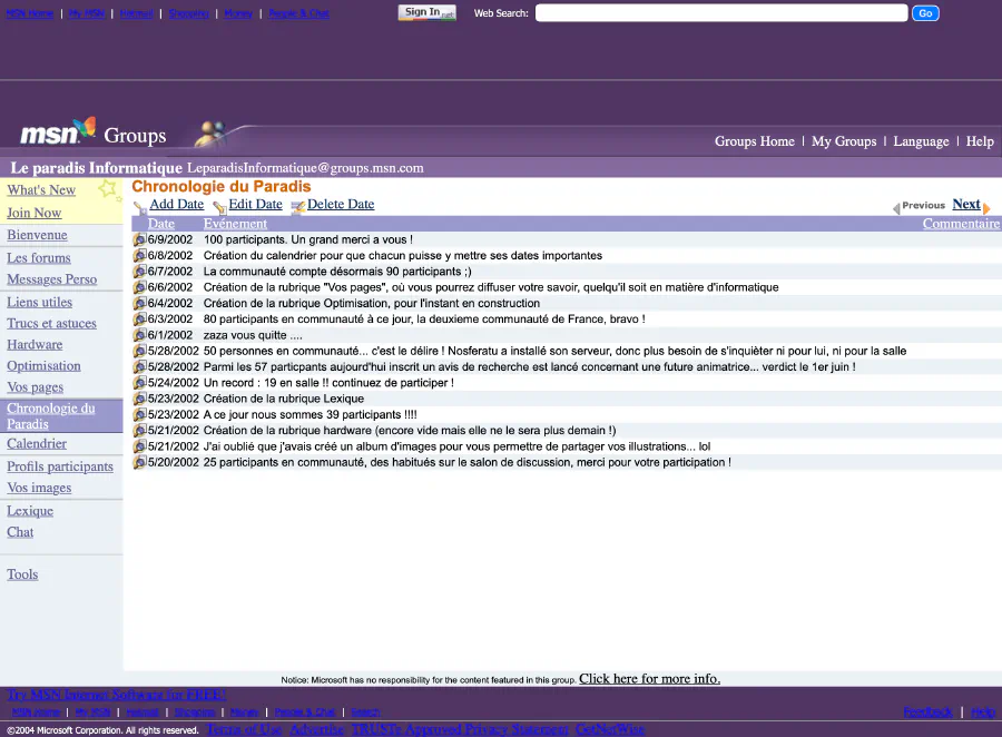Du coup, j’accédais à MSN Communities depuis chez moi ; je fréquentais d’abord le salon Love Net PC avant de créer ma propre communauté en 2002 : Le Paradis Informatique (zaza, si tu te reconnais 👋).