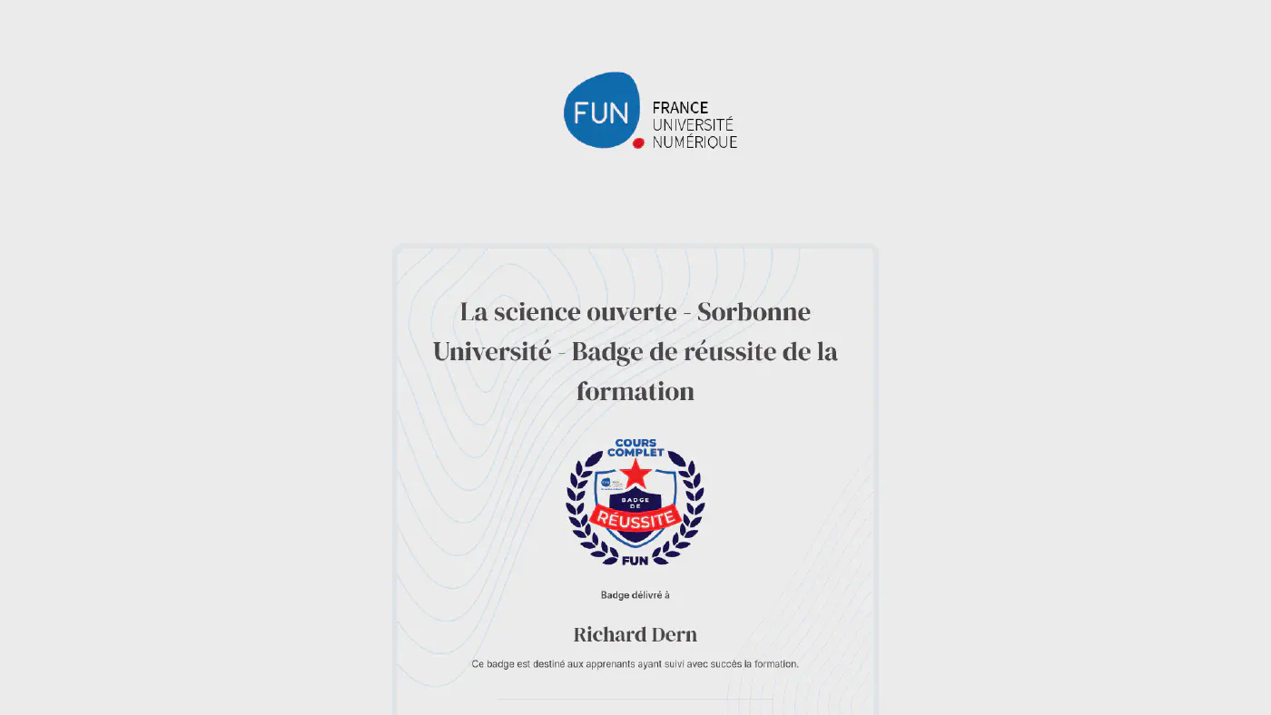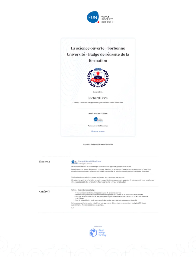J’ai complété une deuxième formation sur la plateforme fun-mooc. Après m’être intéressé à la recherche reproductible, je me suis consacré à la science ouverte. J’ai “un peu” mieux réussi, avec un score de 96% mais, soyons honnêtes, cette formation était beaucoup plus accessible puisqu’elle s’adresse à tous, et pas qu’aux chercheurs.