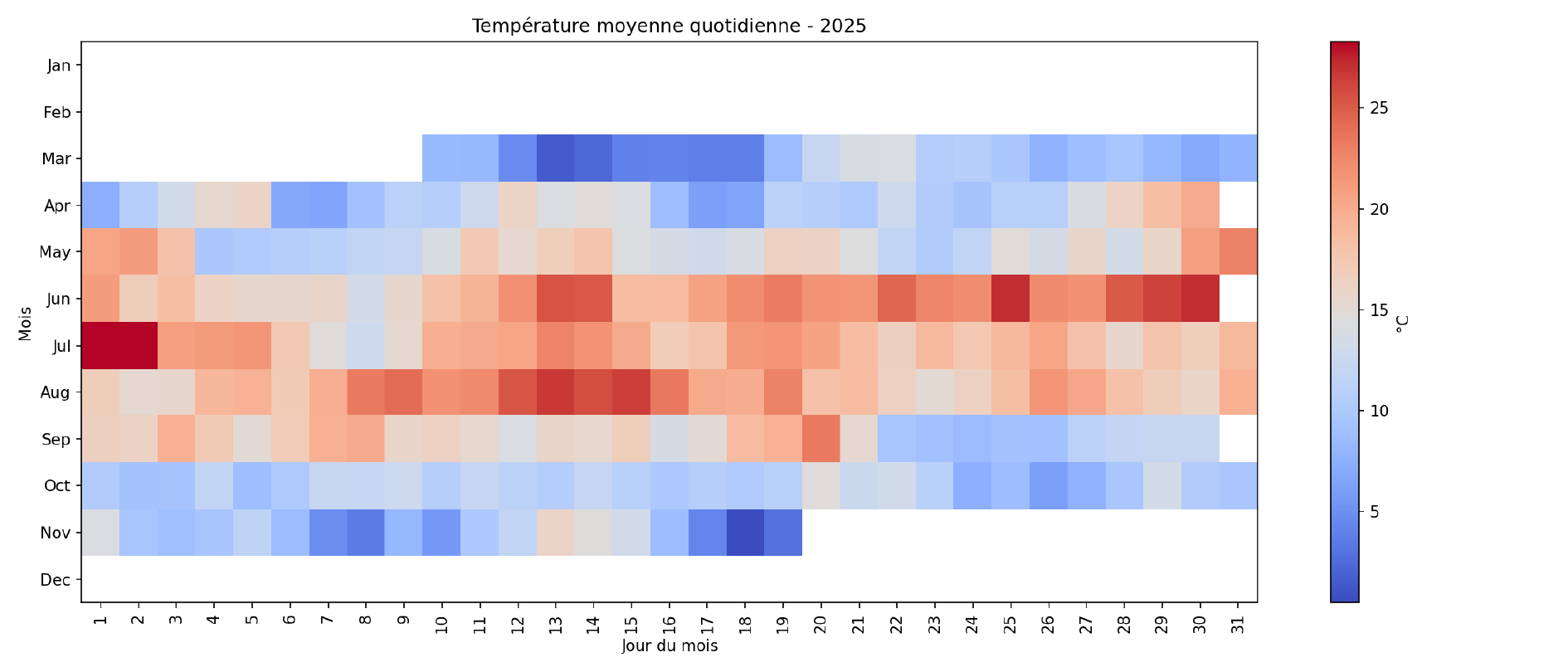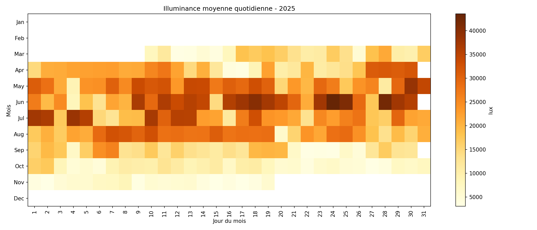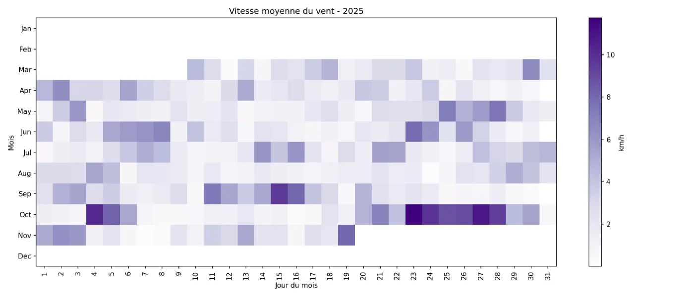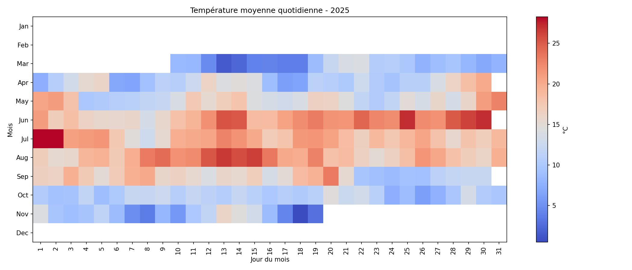 Le second script propose une vue complémentaire sous forme de calendrier thermique (une carte de chaleur disposée en jours et mois). À partir du même dataset minuté, il calcule des moyennes quotidiennes (température, humidité, pression, illuminance, vent) ou des cumuls quotidiens (pluie), puis remplit une matrice « mois x jours » pour l’année la plus récente disponible. Ces vues servent surtout à :