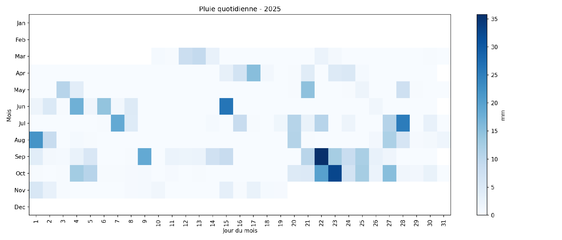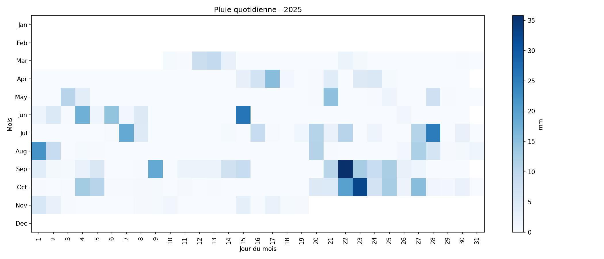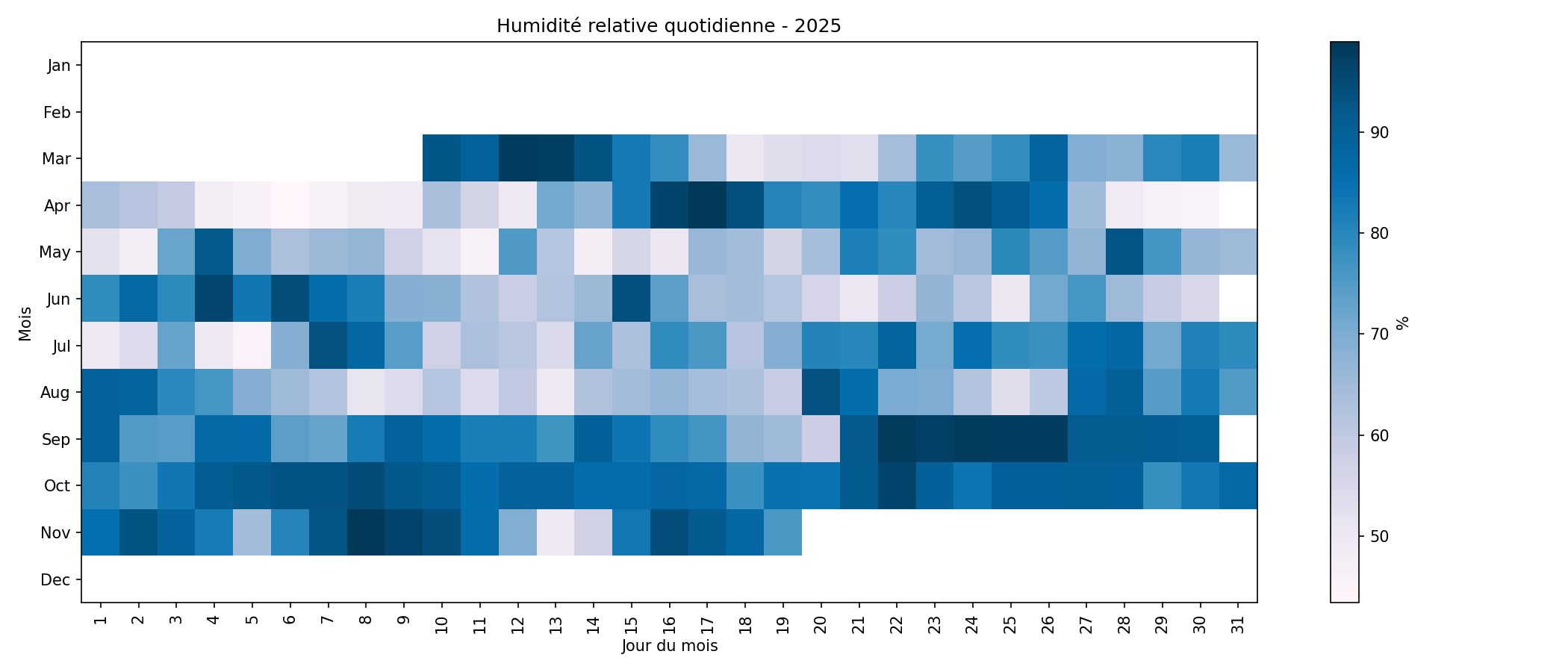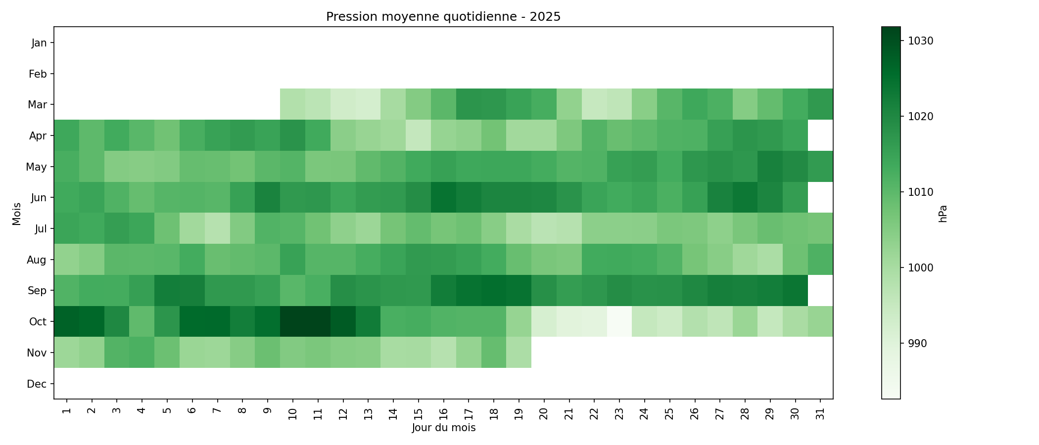 Le second script propose une vue complémentaire sous forme de calendrier thermique (une carte de chaleur disposée en jours et mois). À partir du même dataset minuté, il calcule des moyennes quotidiennes (température, humidité, pression, illuminance, vent) ou des cumuls quotidiens (pluie), puis remplit une matrice « mois x jours » pour l’année la plus récente disponible. Ces vues servent surtout à :