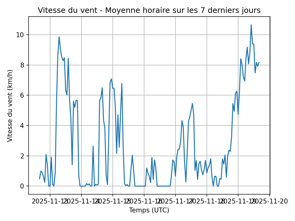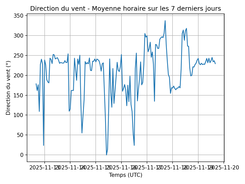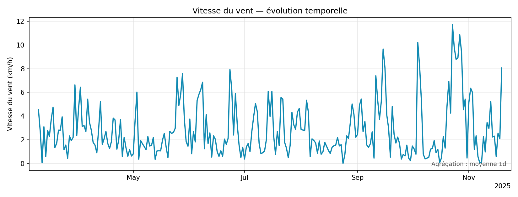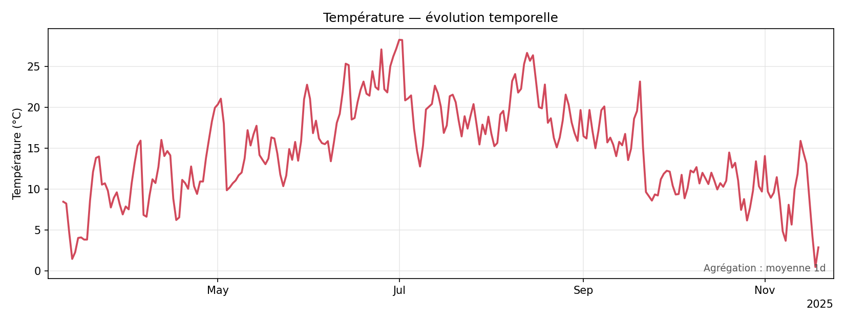 Ce script lit data/weather_minutely.csv, sélectionne éventuellement une fenêtre temporelle (par exemple les derniers jours si l’on utilise l’option --days) puis choisit une fréquence d’agrégation adaptée pour ne pas saturer le graphique en points.