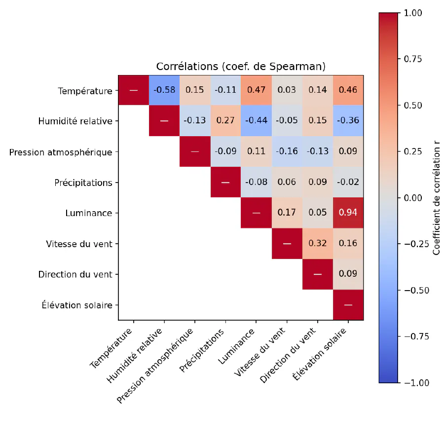 Le signe et l’intensité des coefficients montrent à quel point deux variables bougent ensemble au même instant (co‑mouvement linéaire pour Pearson, monotone pour Spearman). Cette matrice sert donc surtout de carte globale : repérer rapidement les couples très corrélés ou indiquer un lien physique évident, mettre en alerte des variables à forte corrélation qui pourraient masquer d’autres effets (saisonnalité, cycle jour/nuit), et choisir quelles paires méritent qu’on teste des décalages temporels ou des relations non linéaires dans la suite.