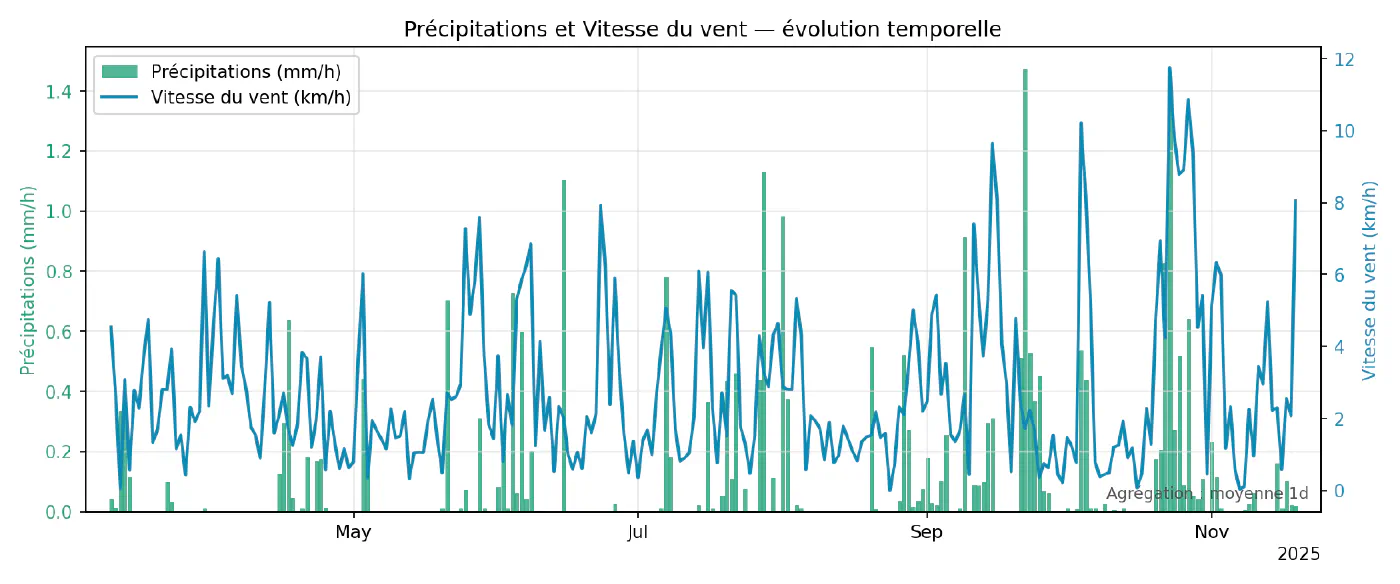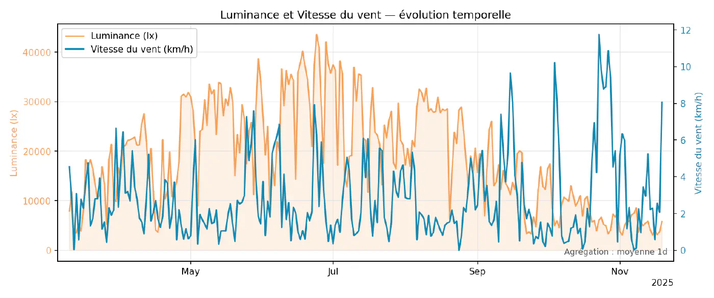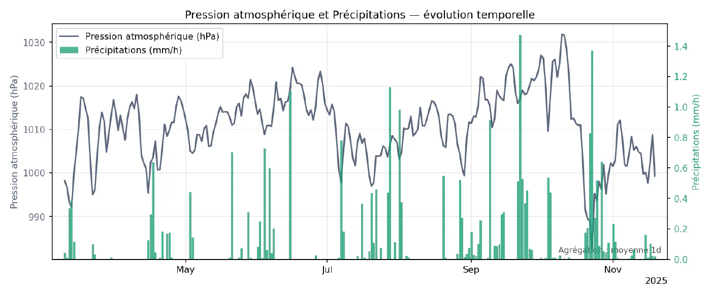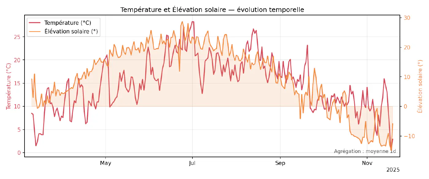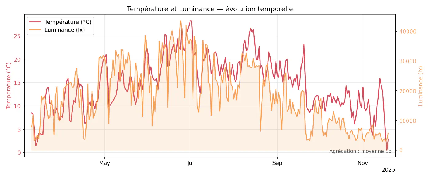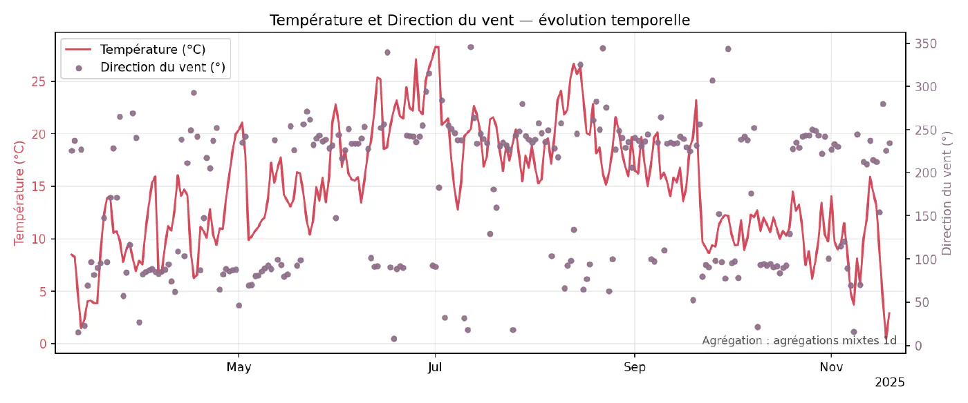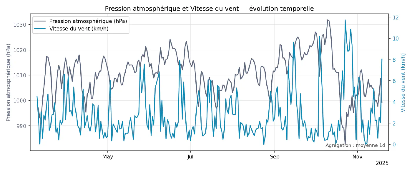 Ce script parcourt toutes les paires de variables disponibles et produit, pour chacune, un graphique superposant les deux séries sur le même axe temporel (ou sur deux axes verticaux si nécessaire). Les données sont ré-échantillonnées pour limiter le nombre de points et lisser légèrement le bruit, en utilisant les mêmes mécanismes que dans le chapitre 3. Ces superpositions servent surtout à repérer des co‑évolutions évidentes (par exemple humidité qui baisse quand la température monte) ou, au contraire, des paires qui semblent indépendantes à l’œil nu.