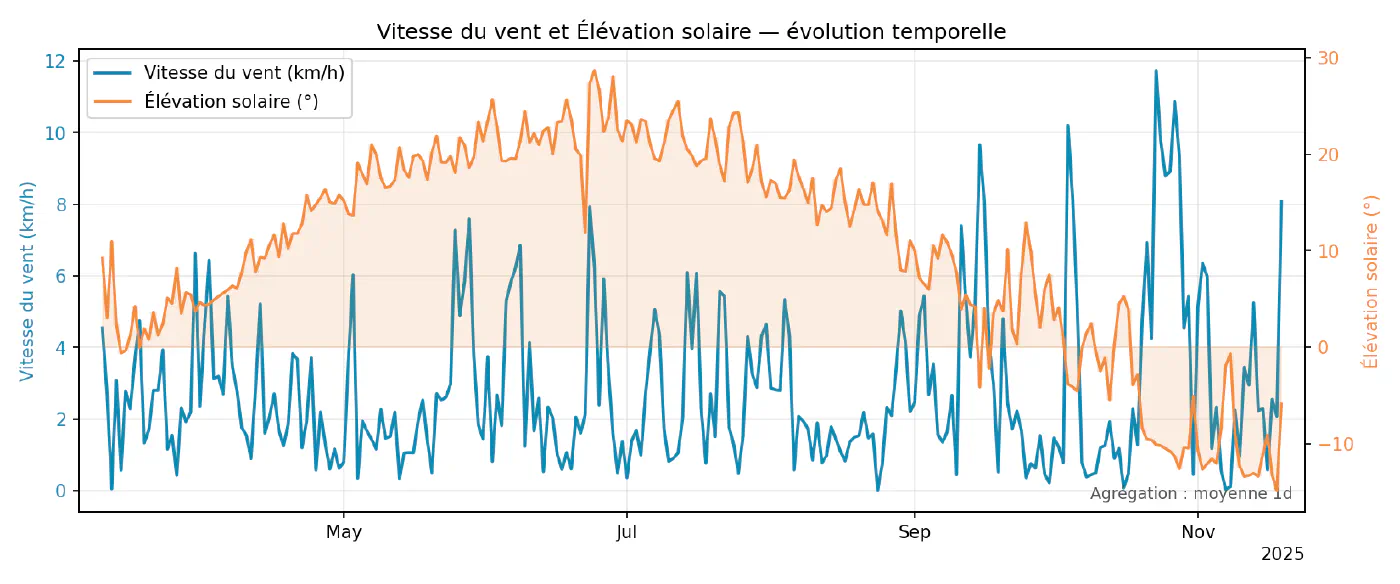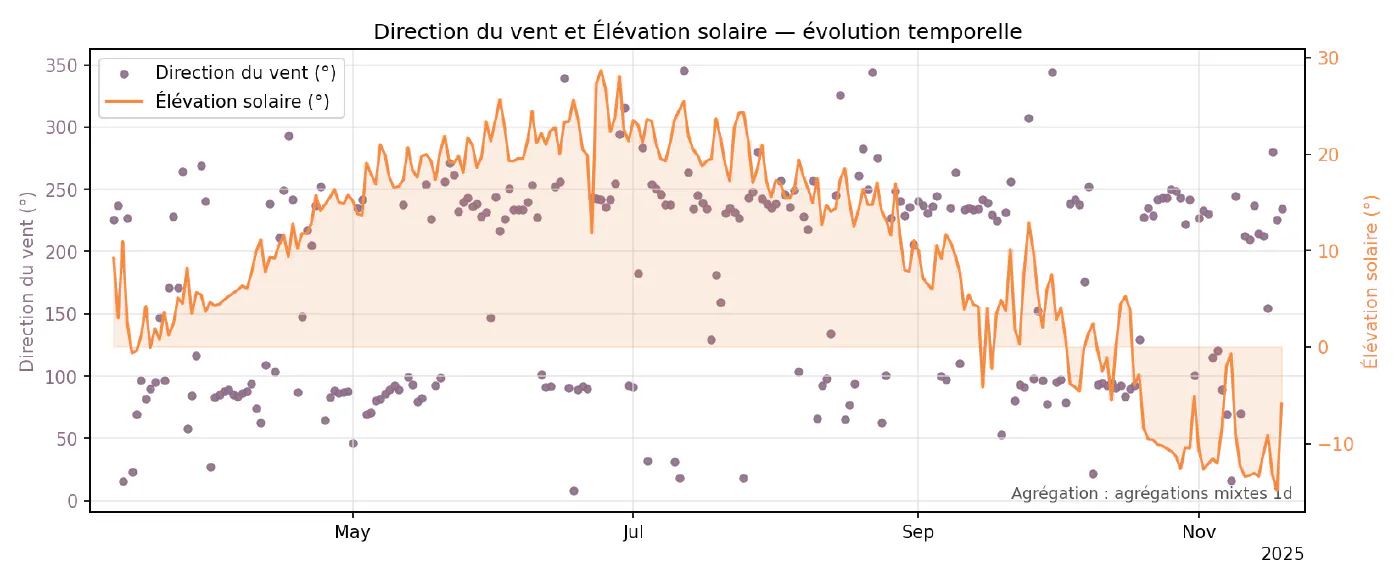 Enfin, on se concentre sur le vent : d’abord sa vitesse en lien avec l’élévation solaire, puis la direction comparée à cette même référence.