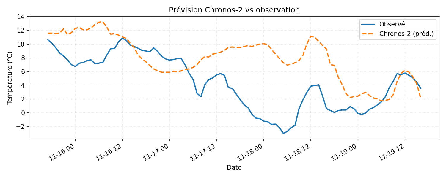 Le modèle small ressort comme le meilleur compromis : MAE ≈ 3,68 °C, RMSE ≈ 4,53 °C, alors que les versions mini et base sont derrière (MAE ≈ 4,18–4,24 °C, RMSE ≈ 5,3–5,6 °C) sur cette fenêtre. Autrement dit, “monter en taille” n’améliore pas la prévision à 96 h sur nos données ; Chronos‑small fait ici légèrement mieux que ses voisins, pour un coût de calcul encore raisonnable.