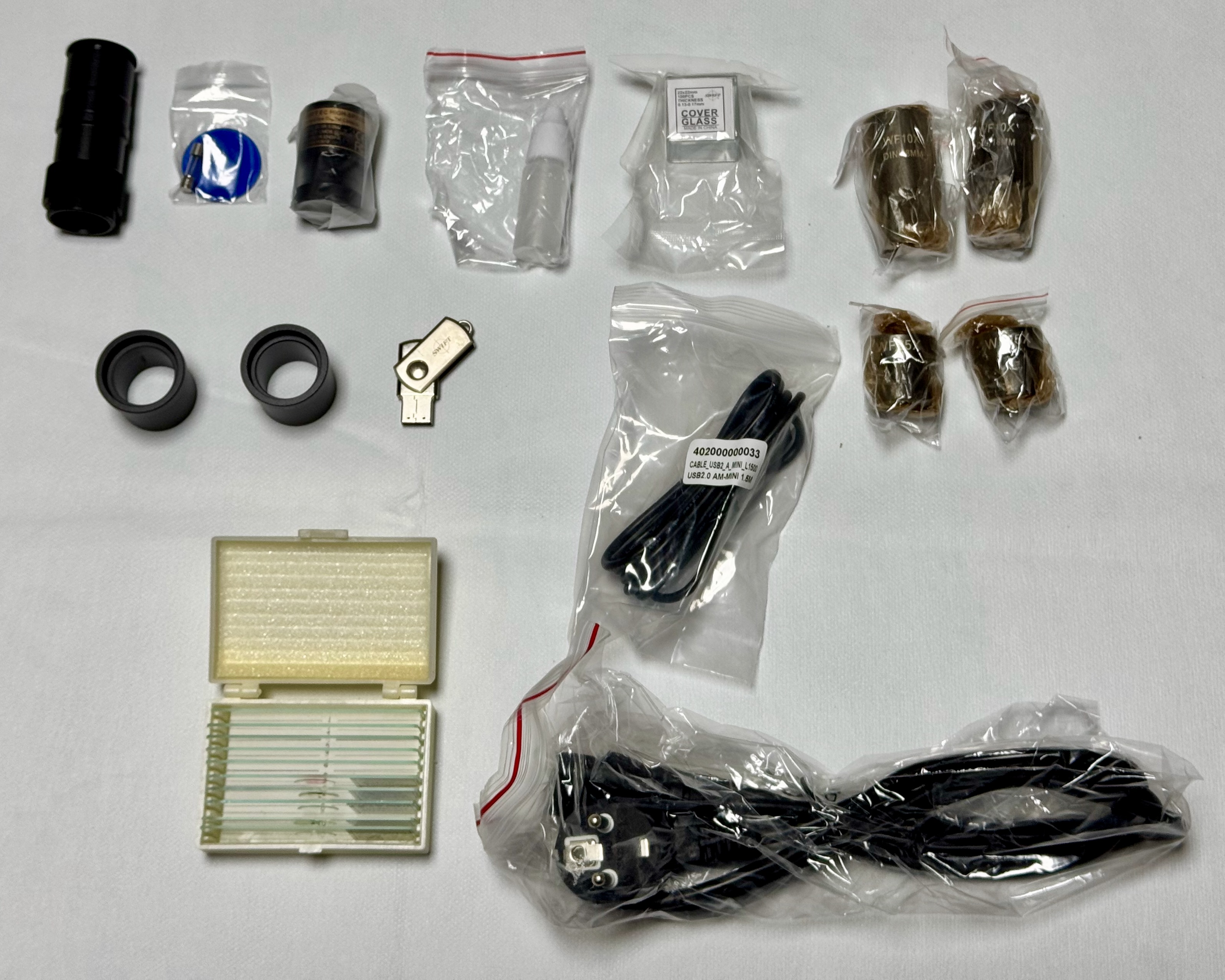 Tout le contenu du packaging est là. De haut en bas et de gauche à droite : tube pour caméra, filtre bleu et fusible de rechange, caméra, huile à immersion, boîte de lamelles, oculaires 10x, adaptateurs pour oculaires (non utilisés pour le moment), clé USB, câble USB, oculaires 25x, boîte à lames et câble d’alimentation français.