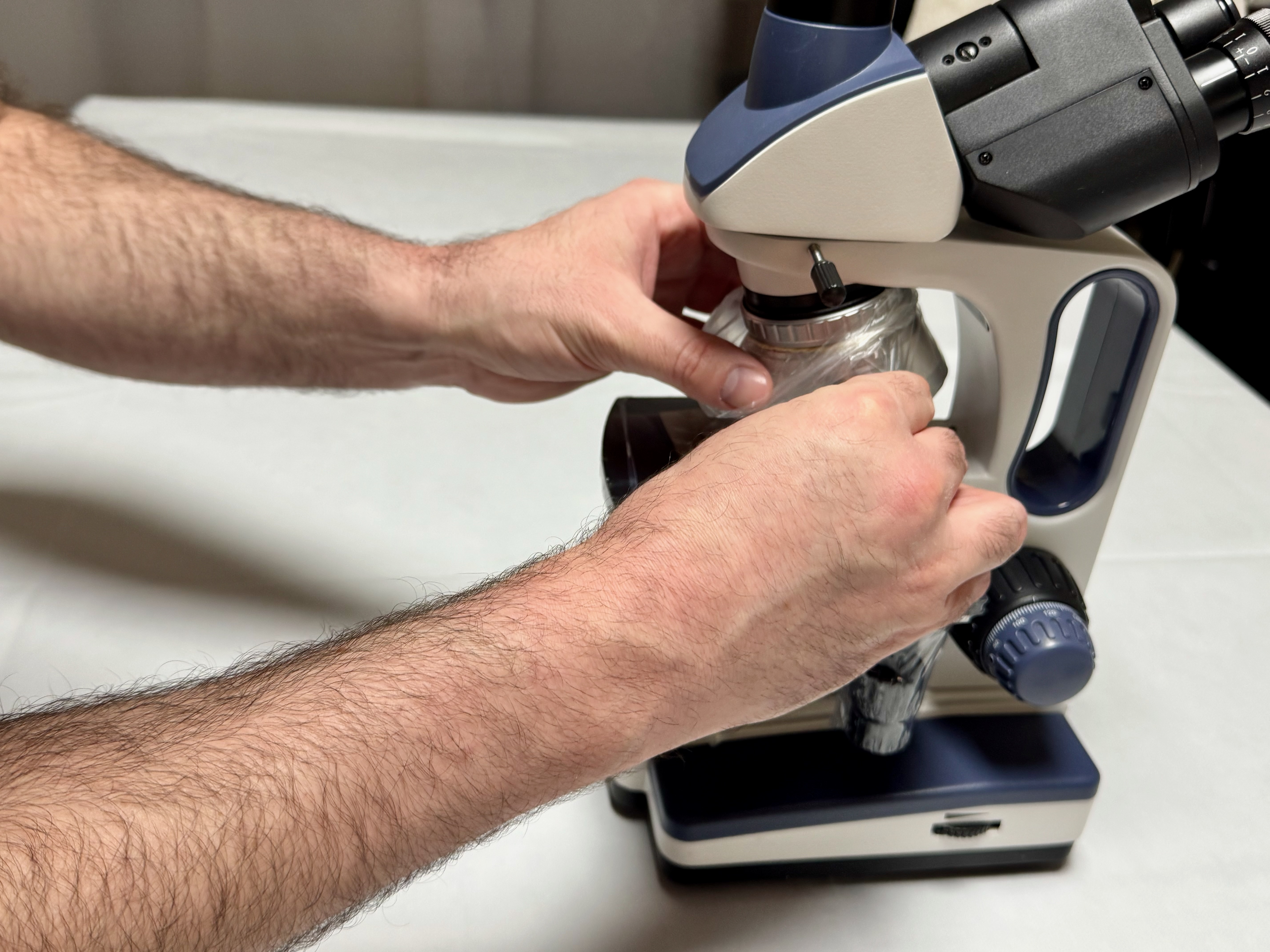 Détail de la tête du microscope. La vis pour la désolidariser du corps est visible sur la gauche. Le tube vertical en arrière-plan est l’oculaire destiné à la caméra.