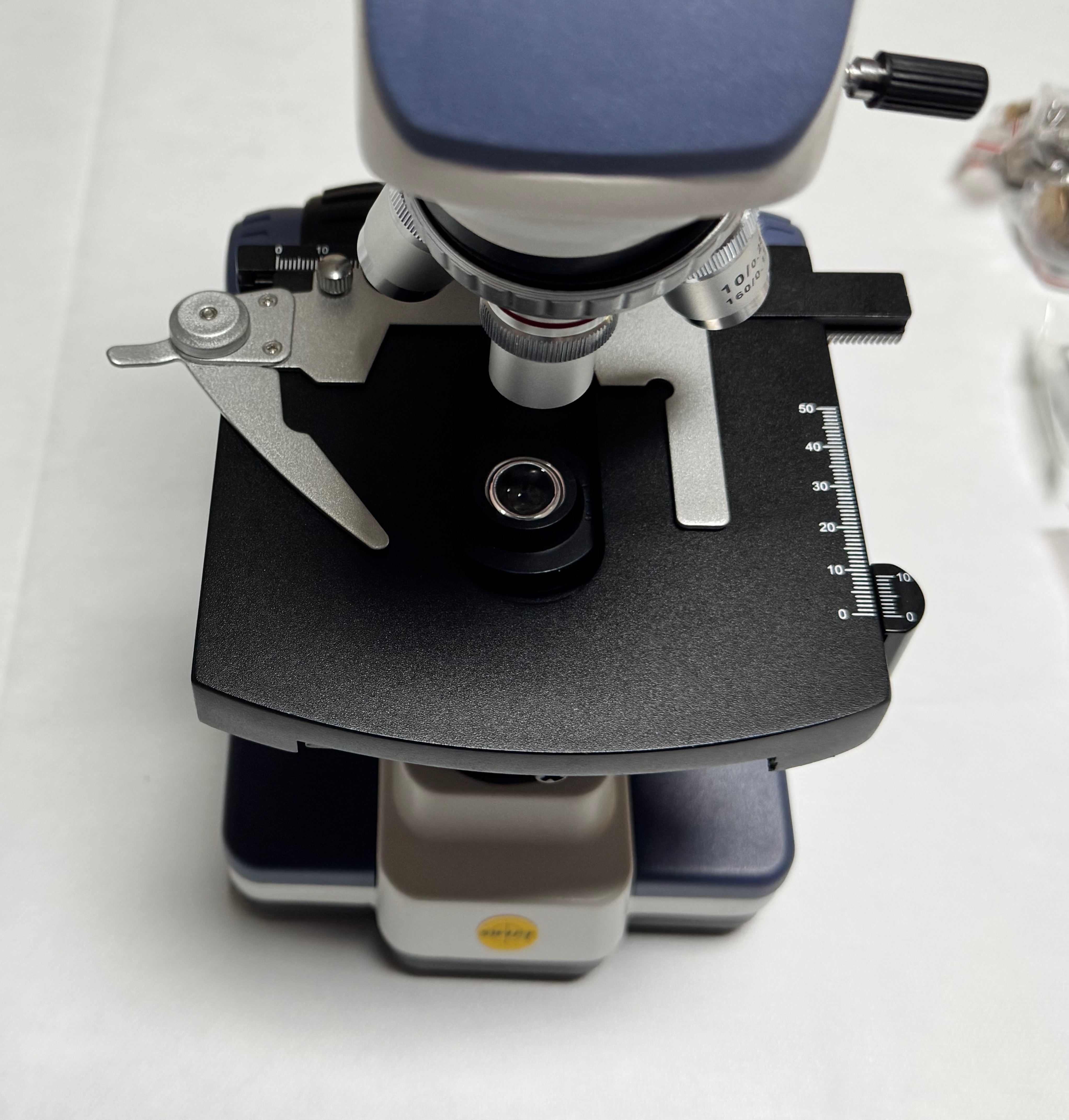 Les objectifs de 40x et 100x sont à ressort (cela permet de protéger la lentille en cas de contact avec l’échantillon observé) et le 100x est prévu pour être utilisé avec l’huile à immersion. Il peut être utilisé sans, mais la netteté ou son pouvoir grossissant en seront affectés.