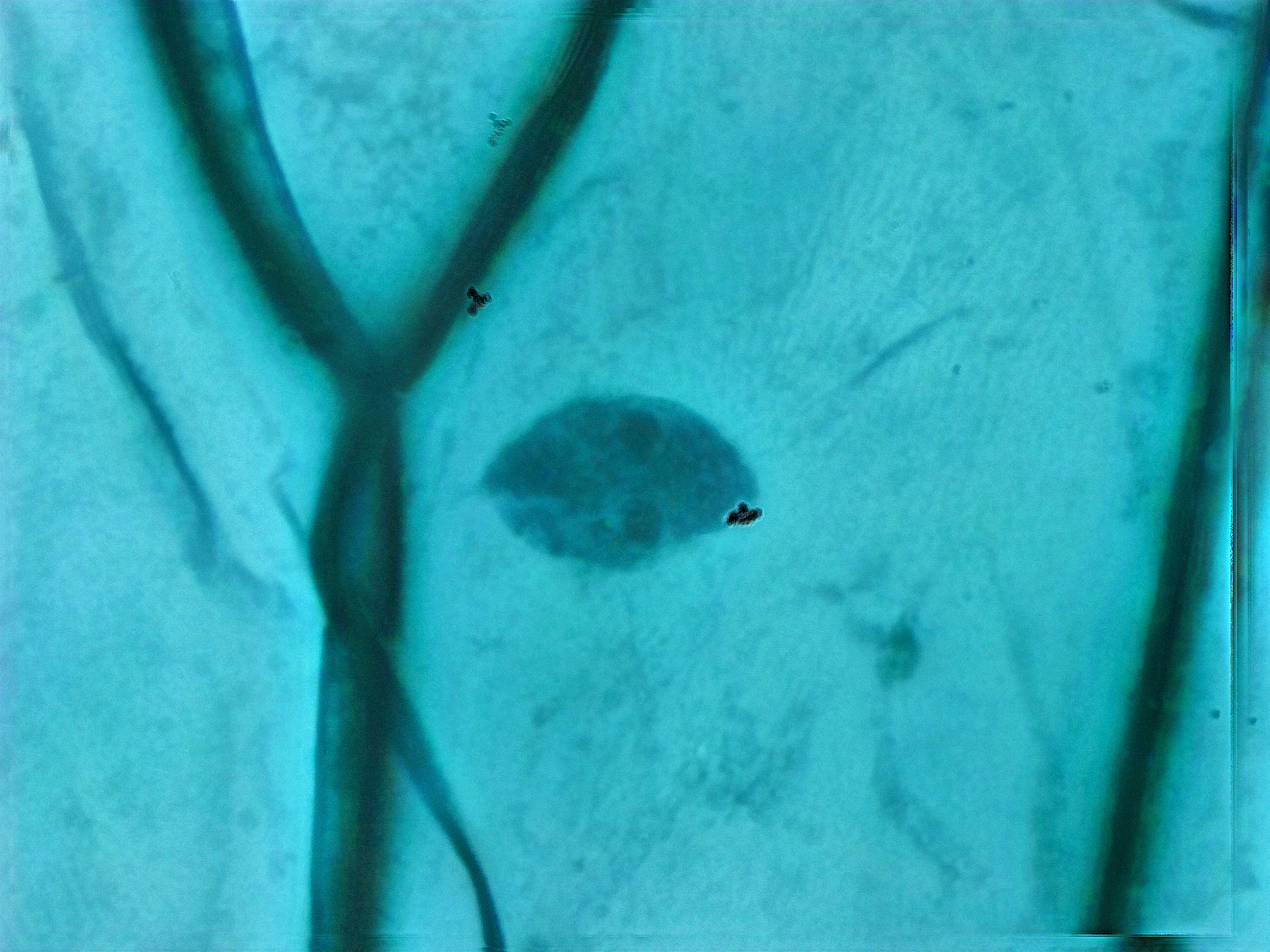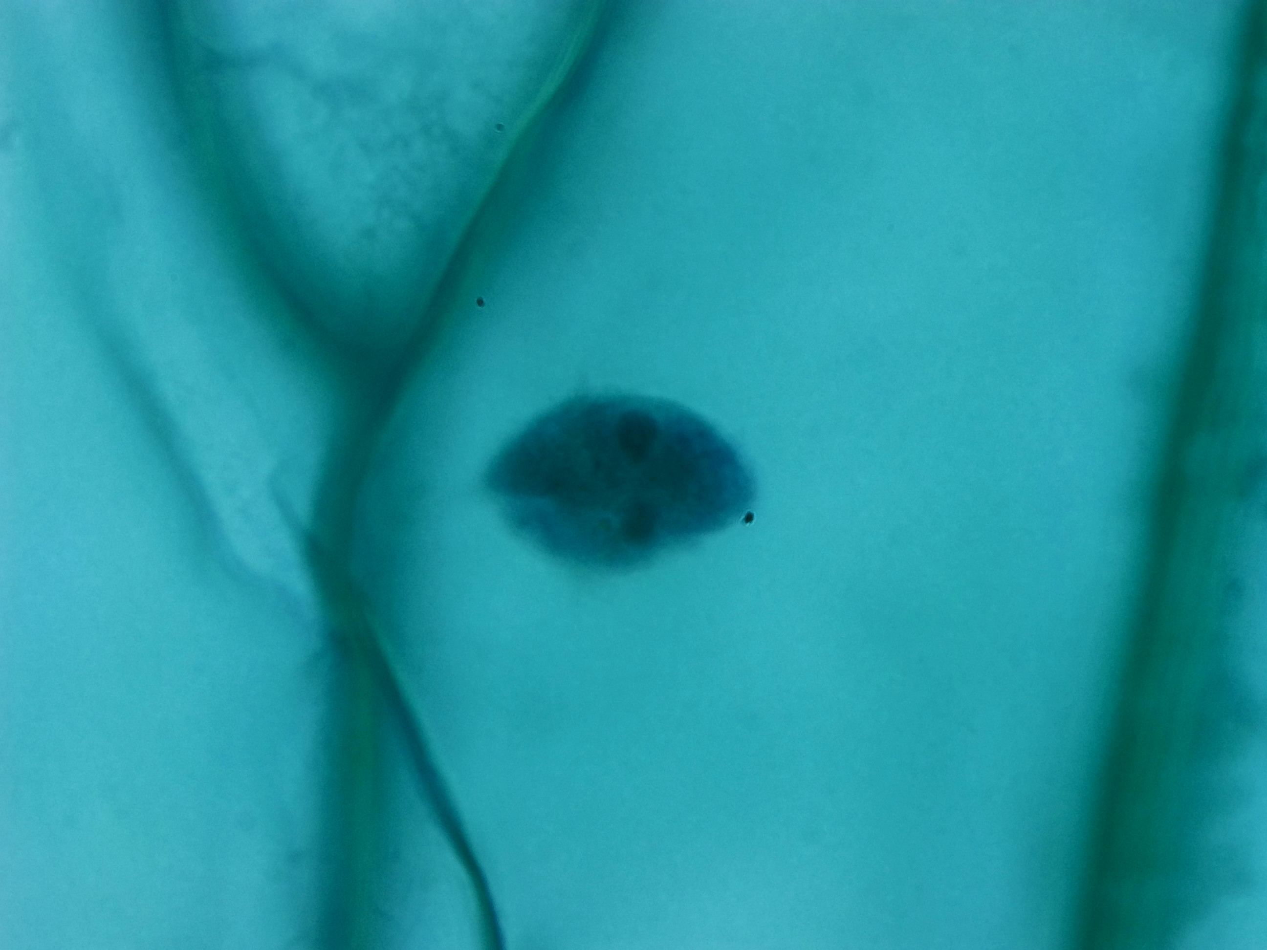 Quand on commence à explorer les grossissements supérieurs au 10x, il devient intéressant de jouer avec le condenseur et son diaphragme : cela permet notamment d’intervenir sur le contraste de l’image. Ici, cela m’a permis de mettre en évidence ce qui semble être le nucléole de la cellule.