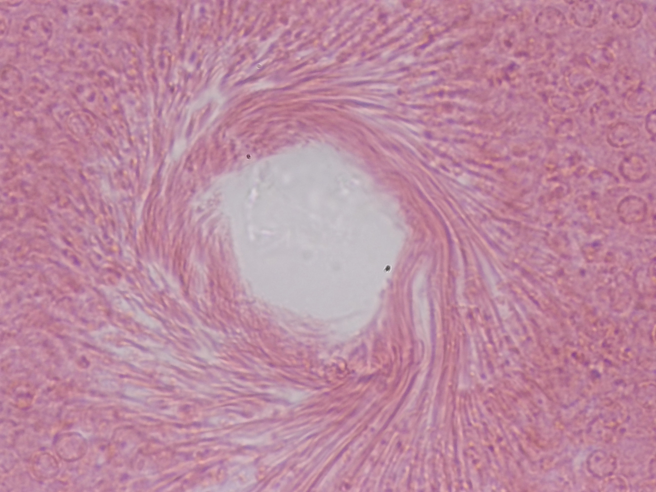 C’est au centre de ce “vortex” (ici vu au 40x) que sont libérés les spermatozoïdes à l’issue de la spermatogenèse.