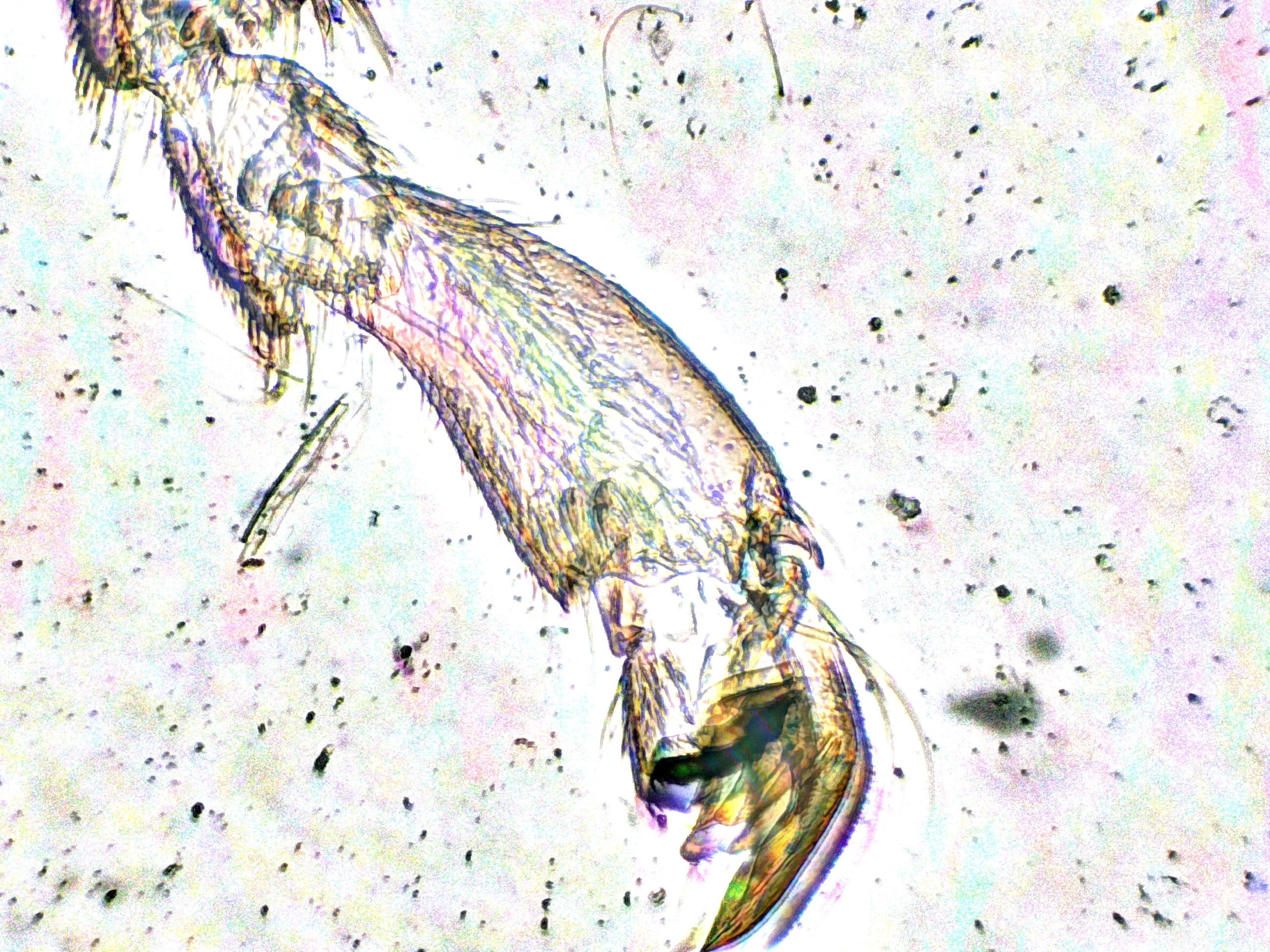 Pour cette prise de vue, je me suis intéressé au tarse et sa partie intermédiaire, la brosse à pollen. Avec l’EDF, on voit très clairement l’implantation des poils utilisés par l’abeille pour se nettoyer ou collecter le pollen. Les taches noires sur le fond blanc extérieur sont des imperfections du verre de la lame.