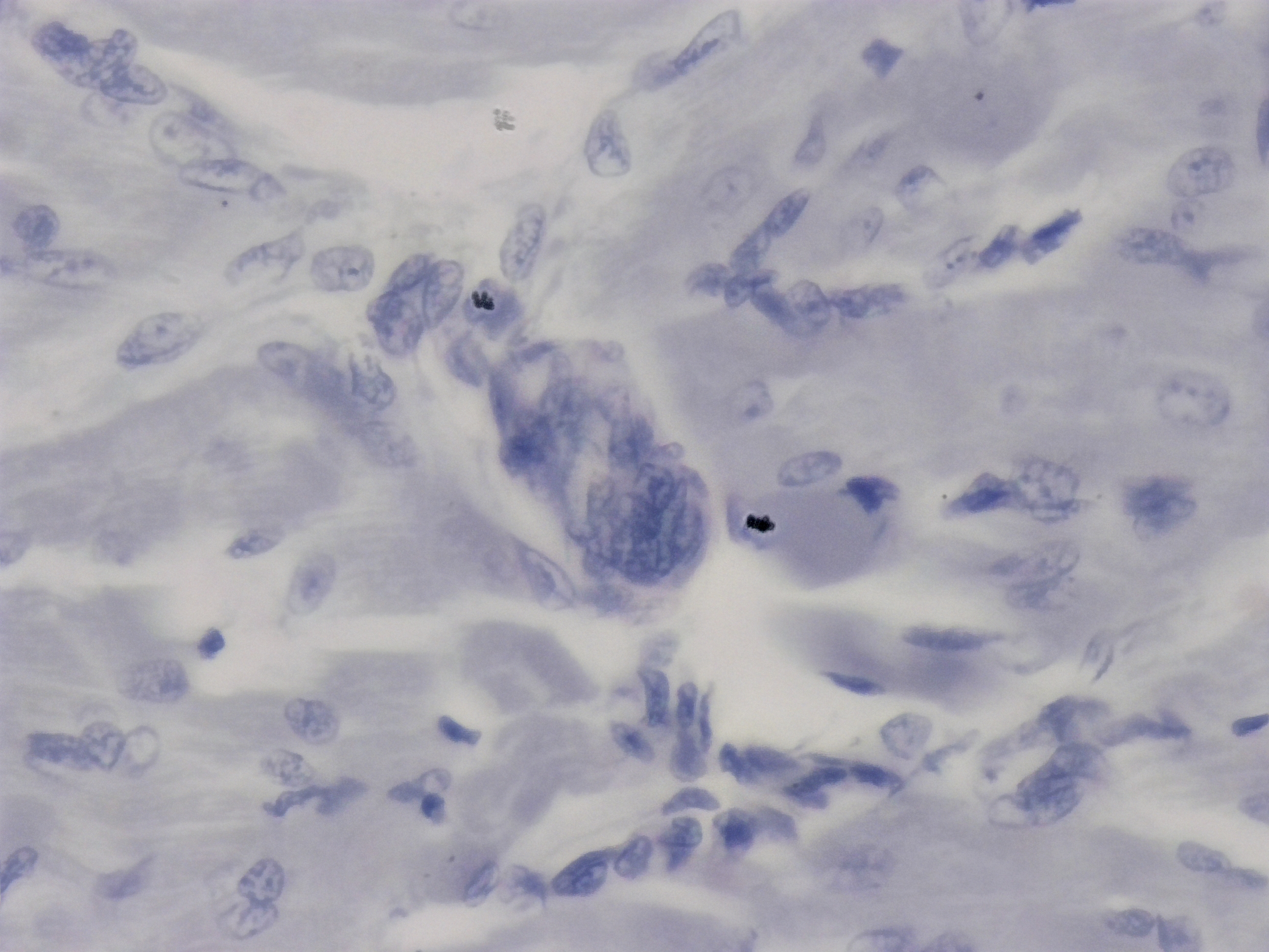En me promenant sur la lame, j’ai pu voir une structure plus sombre que les autres. Au 40x et avec l’EDF, on s’aperçoit qu’il s’agit d’un amas “inattendu” de cellules, probablement du à une petite inflammation ou un léger traumatisme du muscle.