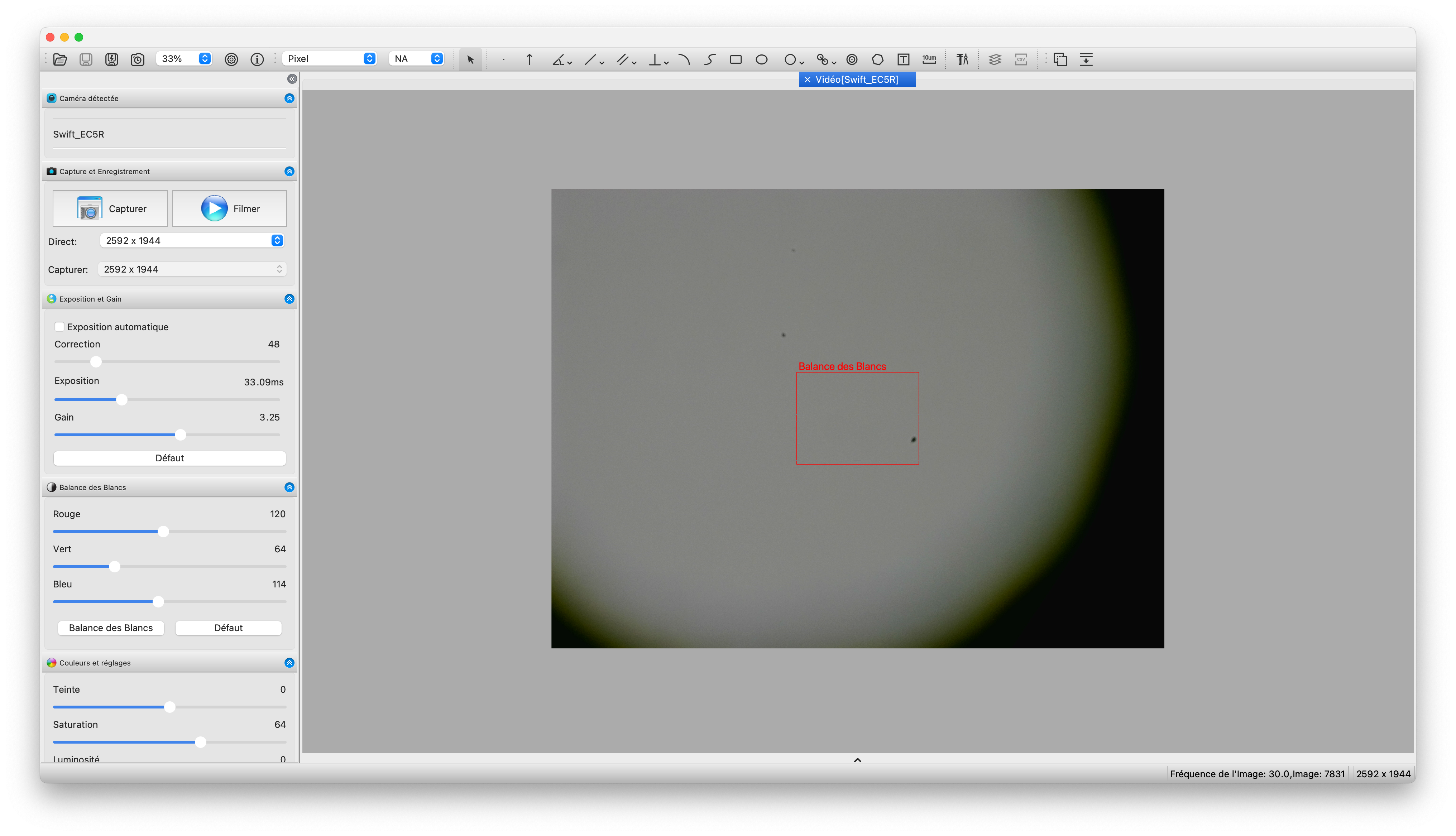 Une fois la caméra sélectionnée, son flux s’affiche dans le volet principal. Notez les trois grains visibles, probablement des poussières que je vais avoir du mal à nettoyer compte tenu de leur localisation. Notez aussi que le diaphragme est désaxé. Cela peut être du à un mauvais alignement du tube de la caméra, ou à une mauvaise conception, je l’ignore encore.
