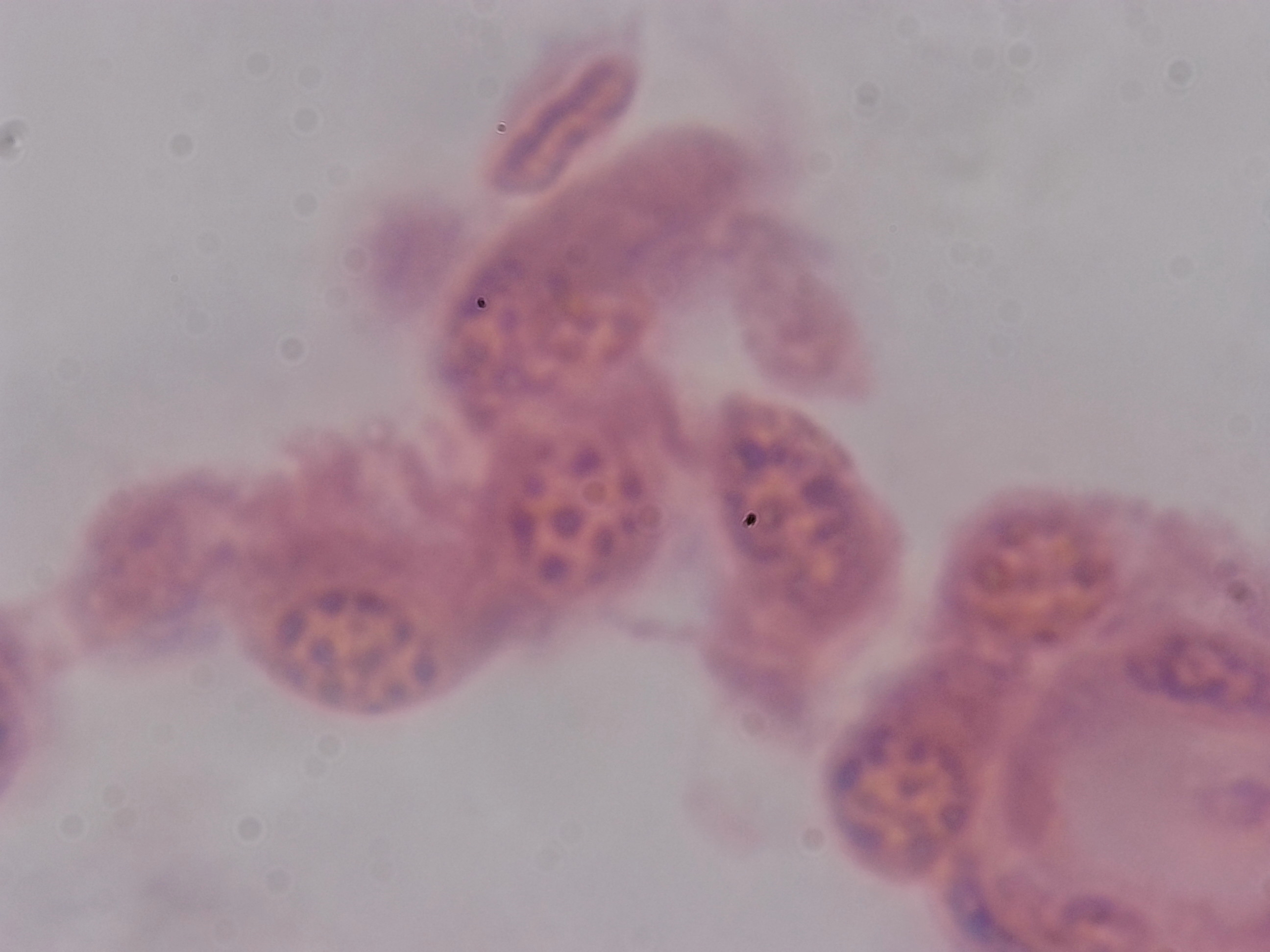 Pour ma première observation à l’objectif 100x, je ne me suis pas risqué à employer l’huile à immersion. Néanmoins, cela permet d’avoir un aperçu un peu plus précis, quoique flou, des cellules de Leydig.