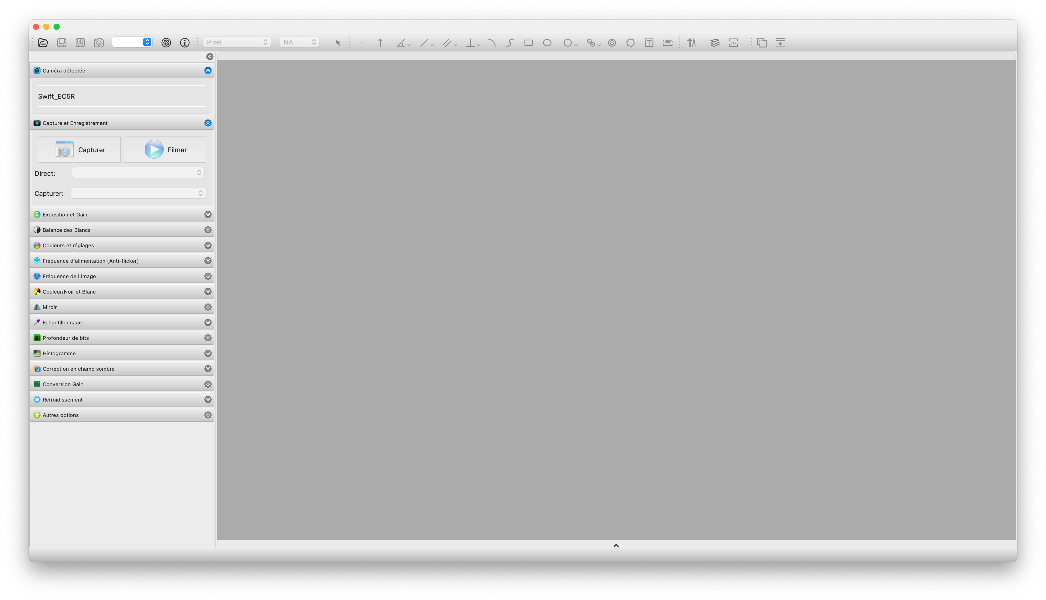 Branchée en USB, la caméra devrait être immédiatement reconnue et listée dans le panneau de gauche. Après l’avoir sélectionnée, les contrôles de paramétrage de la caméra (dans les panneaux inférieurs, toujours à gauche) s’adaptent en fonction des possibilités de la caméra sélectionnée. Mon modèle étant assez basique (comparativement aux autres modèles vendus par Swift), un certain nombre de contrôles disparaissent, épurant ainsi l’interface, ne laissant que le nécessaire.