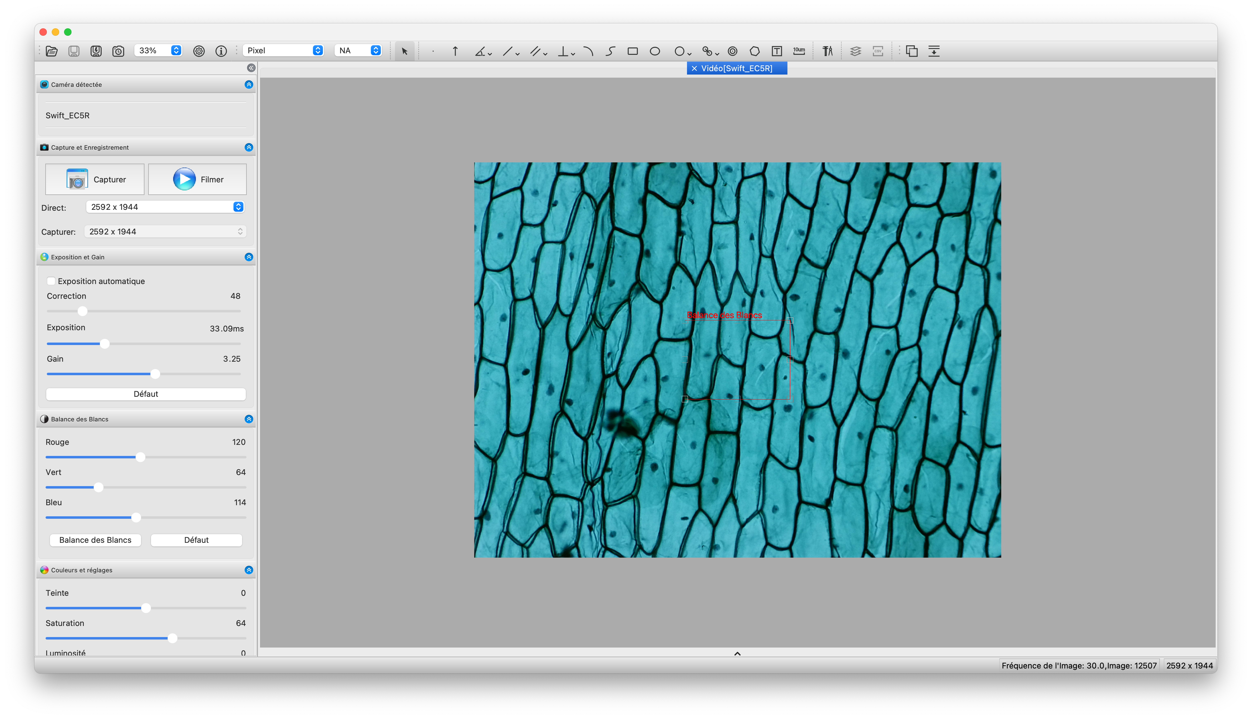 On commence à voir que la maîtrise de la lumière est essentielle. Plus on observe le sujet de près, plus il faut l’éclairer. Ici, bien que l’on puisse assez bien observer les membranes et les noyaux des cellules, j’aurais pu augmenter un peu l’apport de lumière. J’aurais pu aussi corriger l’exposition en post-production avec un logiciel de retouche, voire directement dans Swift Imaging.