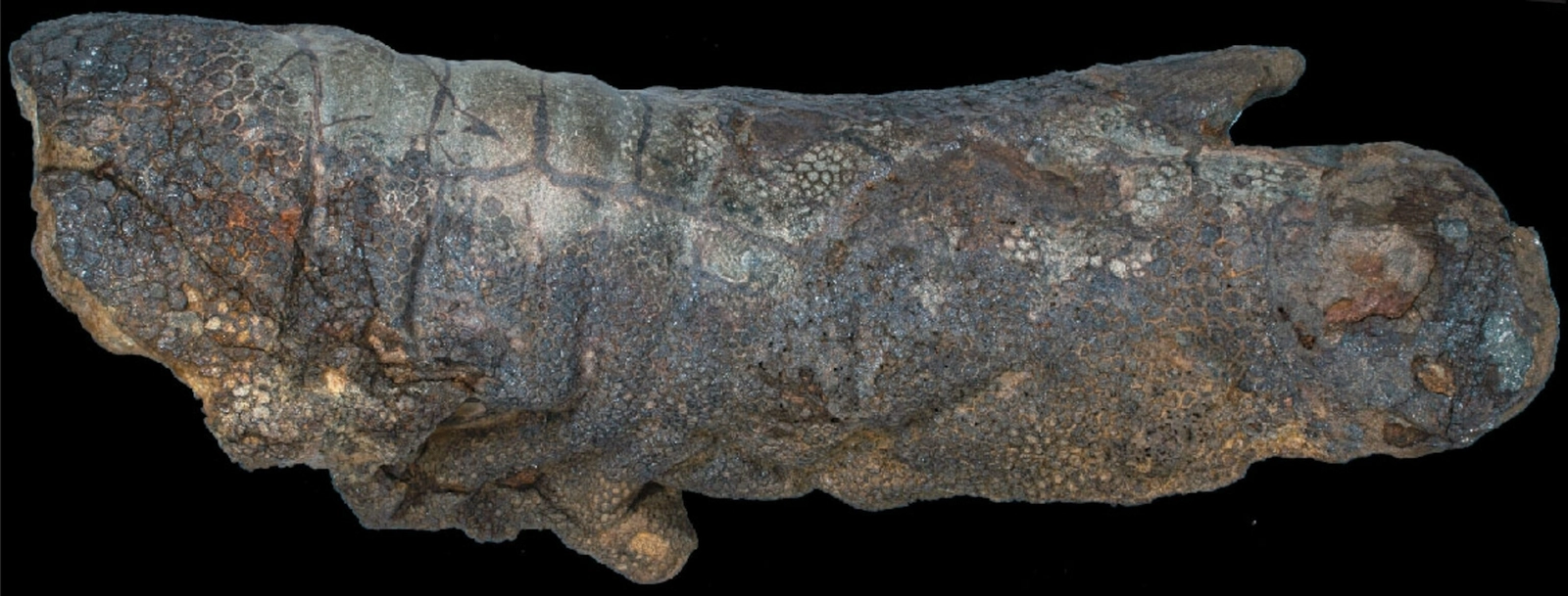 En 2022, Stephanie Drumheller et ses collègues 10 ont étudié un spécimen d’Edmontosaurus remarquablement conservé et ont proposé une voie de préservation bien moins miraculeuse qu’on ne l’imaginait souvent. Des tissus relativement résistants, comme la peau, peuvent persister sans qu’il soit nécessaire d’invoquer un isolement total de la carcasse ni des « conditions exceptionnelles » au sens fort. Le spécimen présentait même des dommages compatibles avec l’activité de carnivores sur les tissus mous. Autrement dit, bien que le corps n’ait pas été parfaitement protégé du monde, il avait malgré tout suivi une trajectoire de conservation favorable.