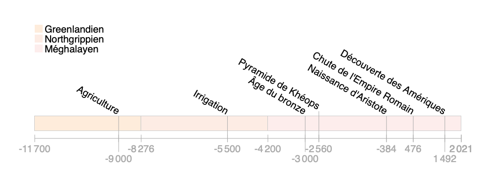 | Méghalayen | -4'200 | Débutée par une période de forte aridité, ayant peut être conduit à la disparition de certaines civilisations comme l’Ancien Empire Egyptien, l’Empire Akkad, ou Liangzhu en Chine |