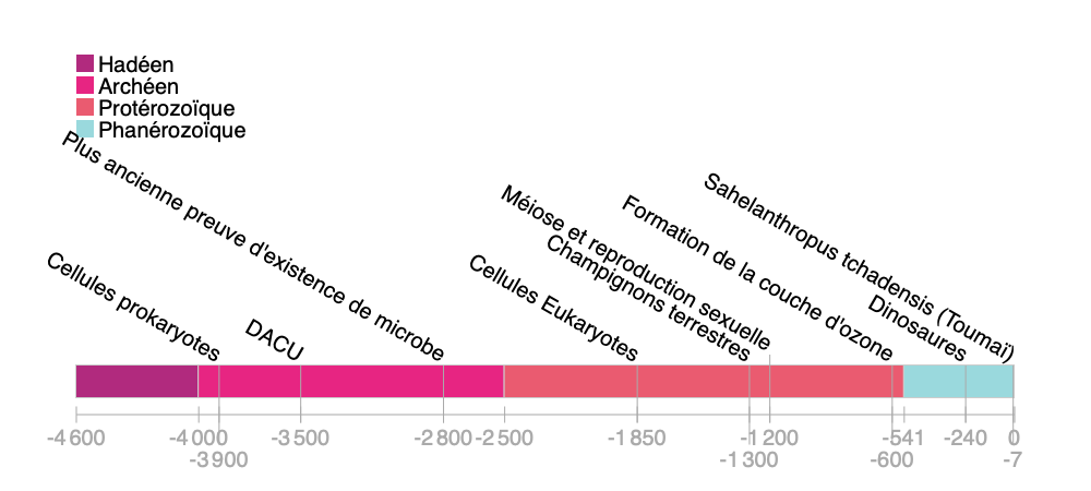 Ces graphiques nous montrent bien la fugacité de notre espèce, et même de notre lignée, mais ils ne témoignent pas de l’activité réelle de la Vie au cours des Âges. Nous avons l’impression que l’Histoire de l’Homme ne devient très riche qu’à partir du Moyen-Âge, ou du Siècle des Lumières, voire à partir de l’industrialisation. Ce sentiment nous incite à croire en un certain calme passé, vaguement ponctué de quelques extinctions de masse, des dinosaures, et d’autres choses mais rien d’aussi riche que l’Histoire de l’Homme. Je suppose que ce sentiment s’explique d’une façon ou d’une autre, même si je ne peux étayer ces propos par des données scientifiques. Mais ce que j’aimerais mettre en avant ici, c’est qu’au contraire, notre Histoire est extrêmement courte par rapport à celle de la Terre, ou même par rapport aux premières espèces vivantes, et au DACU, et sa richesse ne peut en rien être comparée à celle des quatre milliards d’années qui nous ont précédé.