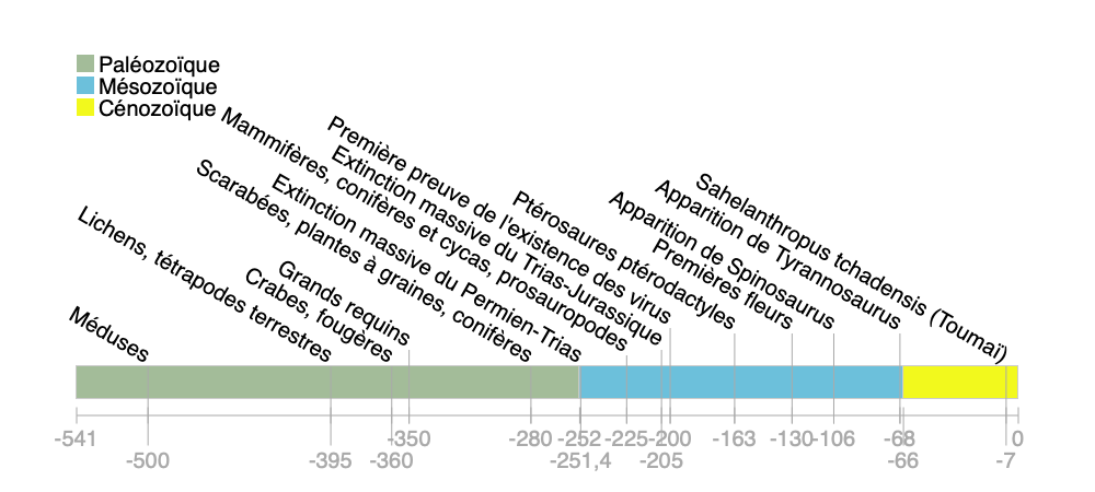 Image #6: Les trois ères du Phanérozoïque. Les dates sont exprimées en millions d’années