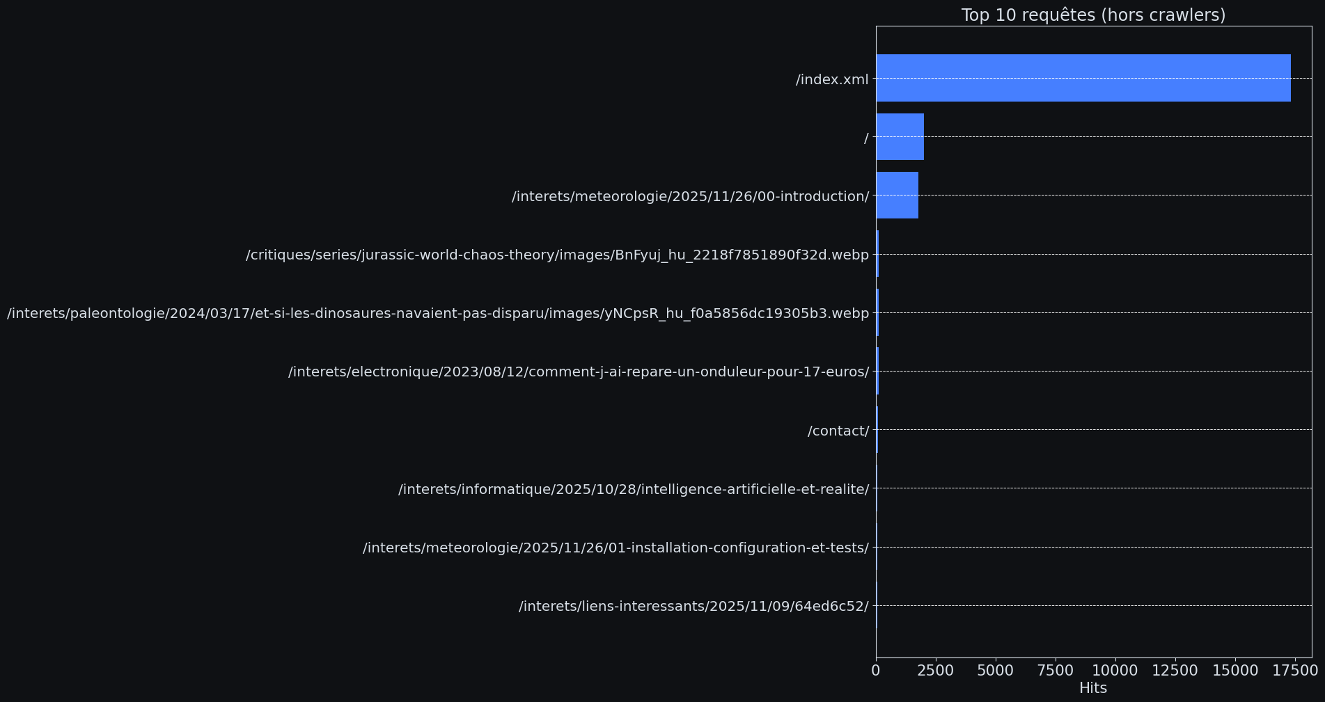 Ces statistiques sont extraites des journaux de mon serveur web uniquement et passées à l’outil GoAccess qui les anonymise (option --anonymize-ip).